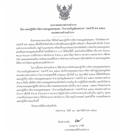 ประกาศเทศบาลตำบลอำนาจ เรื่อง แผนปฏิบัติการจัดการขยะมูลฝอยชุมชน "อำนาจเจริญเมืองสะอาด" ประจำปี พ.ศ.2569 ของเทศบาลตำบลอำนาจ