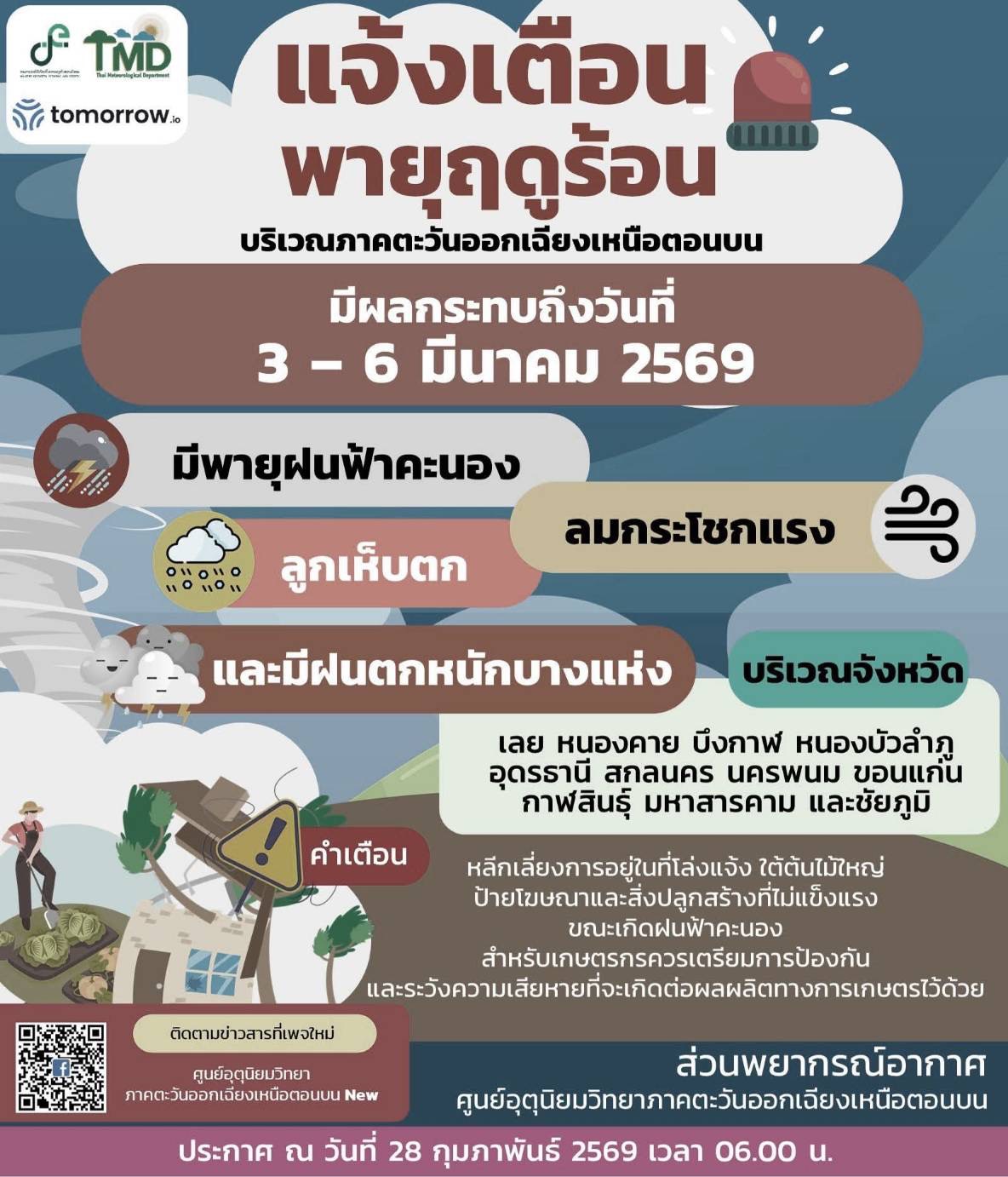 ประชาสัมพันธ์ แจ้งเตือนพายุฤดูร้อน บริเวณภาคตะวันออกเฉียงเหนือตอนบน มีผลกระทบถึงวันที่ 3-ุ6 มีนาคม 2569 มีพายุฝนฟ้าคะนอง ลมกระโชกแรงและมีฝนตกหนักบางแห่ง