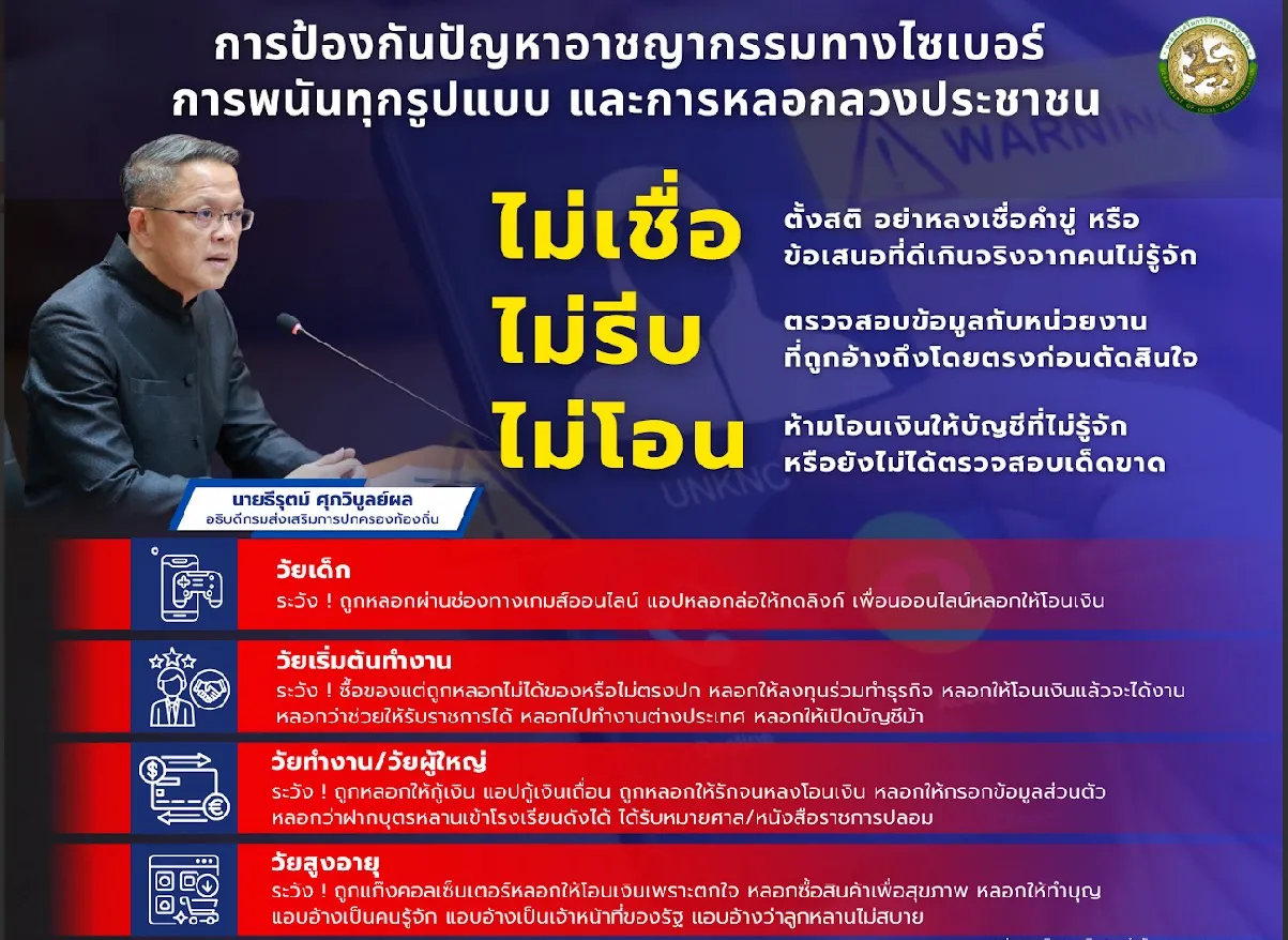 ประชาสัมพันธ์ การป้องกันปัญหาอาชญากรรมทางไซเบอร์ การพนันทุกรูปแบบและการหลอกลวงประชาชน ไม่เชื่อ ไม่รีบ ไม่โอน